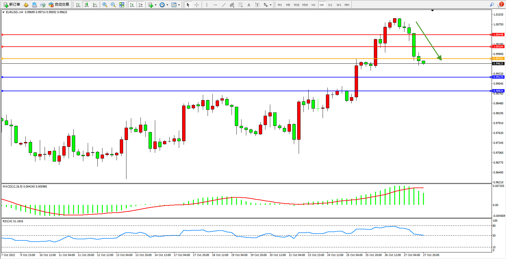 欧元兑美元维持0.99625附近震荡,欧洲央行将三大主要利率均上调75个基点,符合市场预期,为连续第二次大幅加息75个基点。