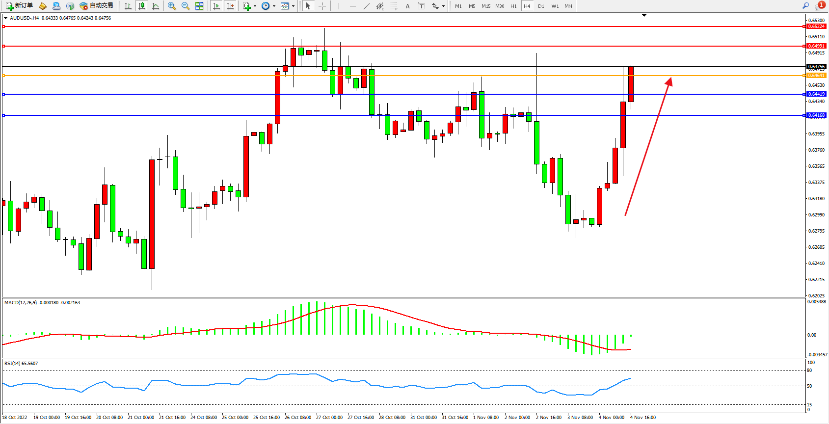 澳元美元AUDUSD——4小时K线图显示: