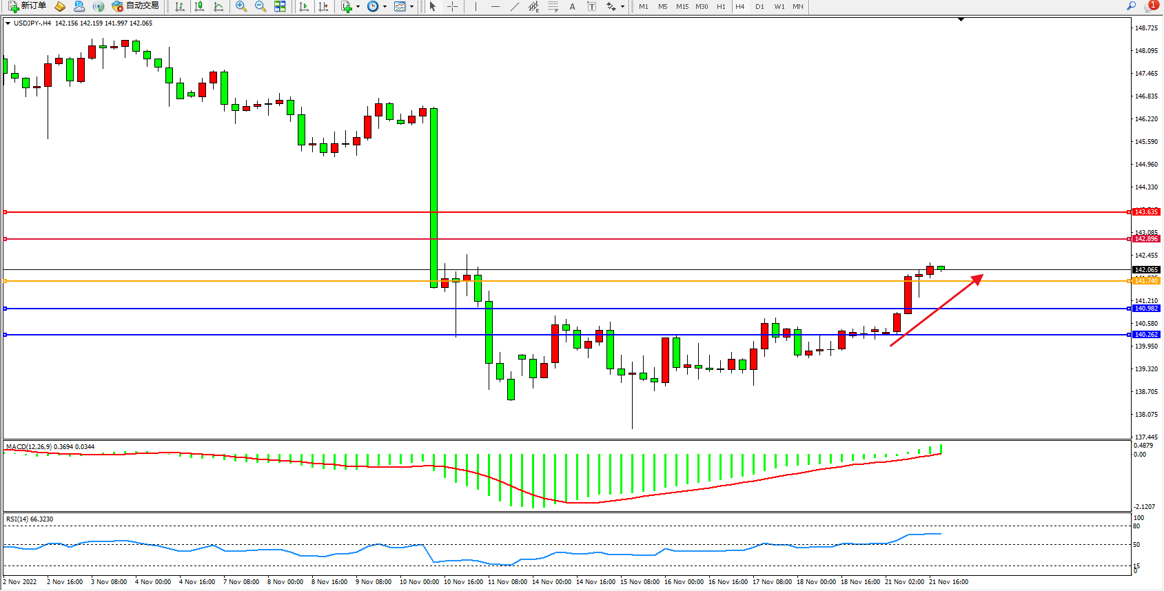 交易策略:141.740上方看涨,目标142.896、143.635