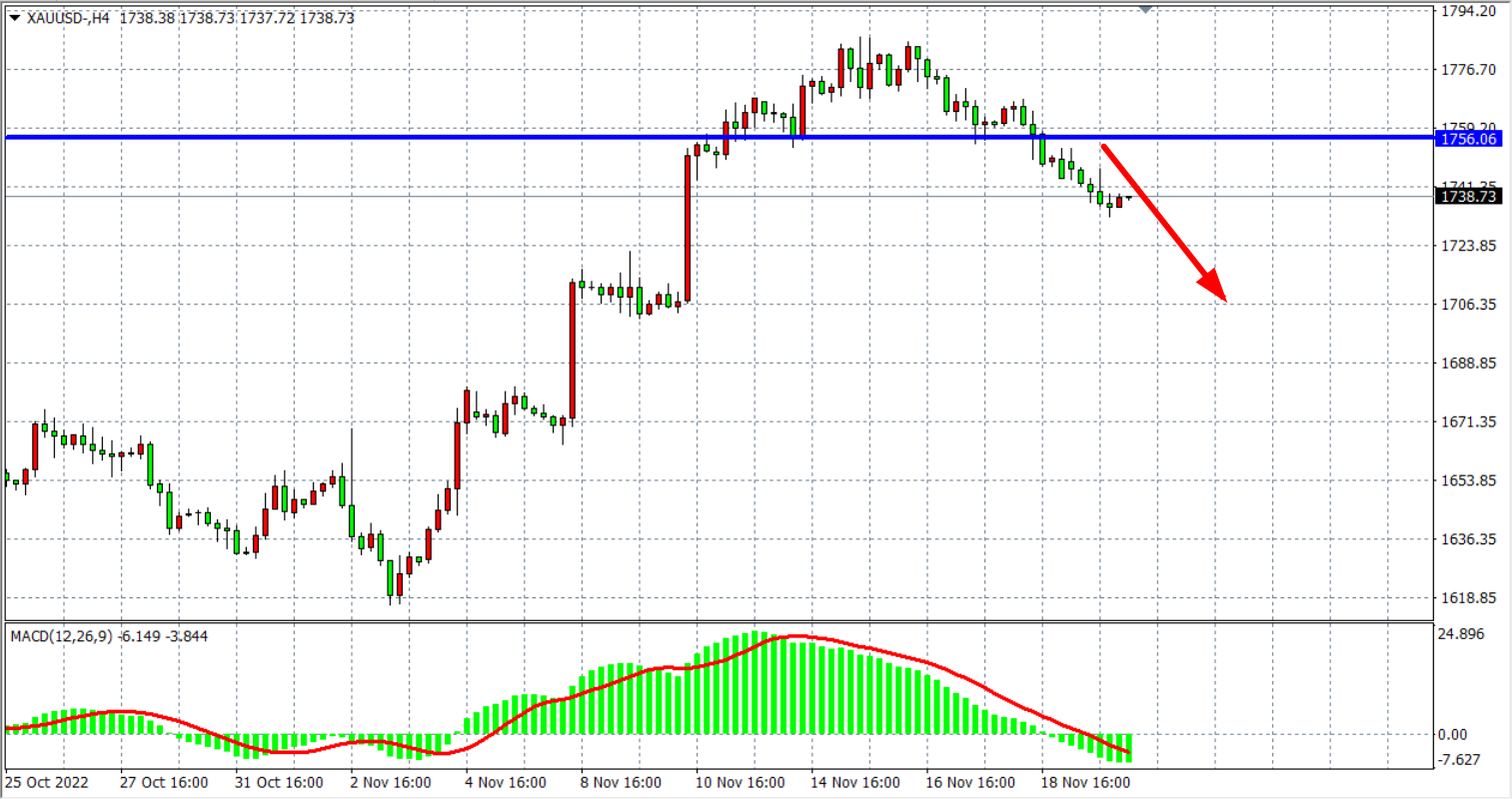 4小时图看,金价回落跌破1756后跌势加速,同时MACD于零轴之下开始放量,显示行情仍有进一步走弱可能,当前压力位继续关注1756附近,日内在该位之下继续看跌为主,下方目标看1730-1715。