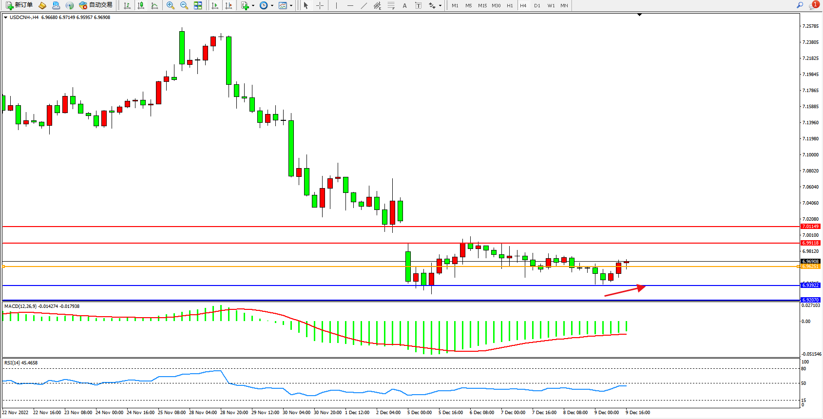 美元人民币USDCNH——4小时K线图显示: