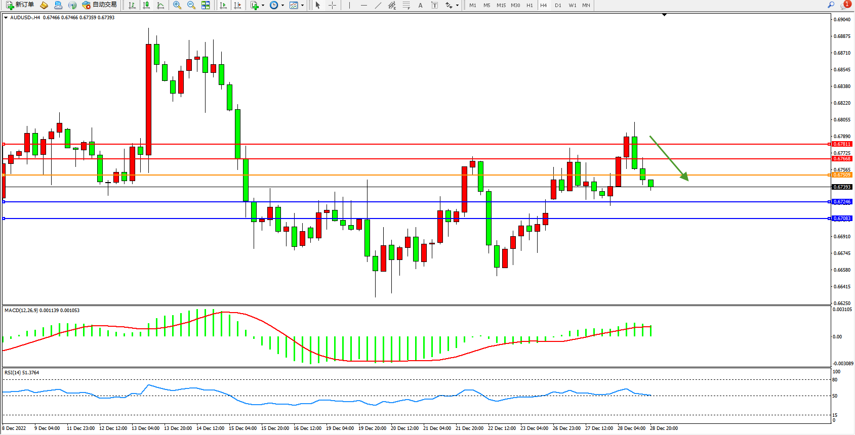 澳元美元AUDUSD——4小时K线图显示: