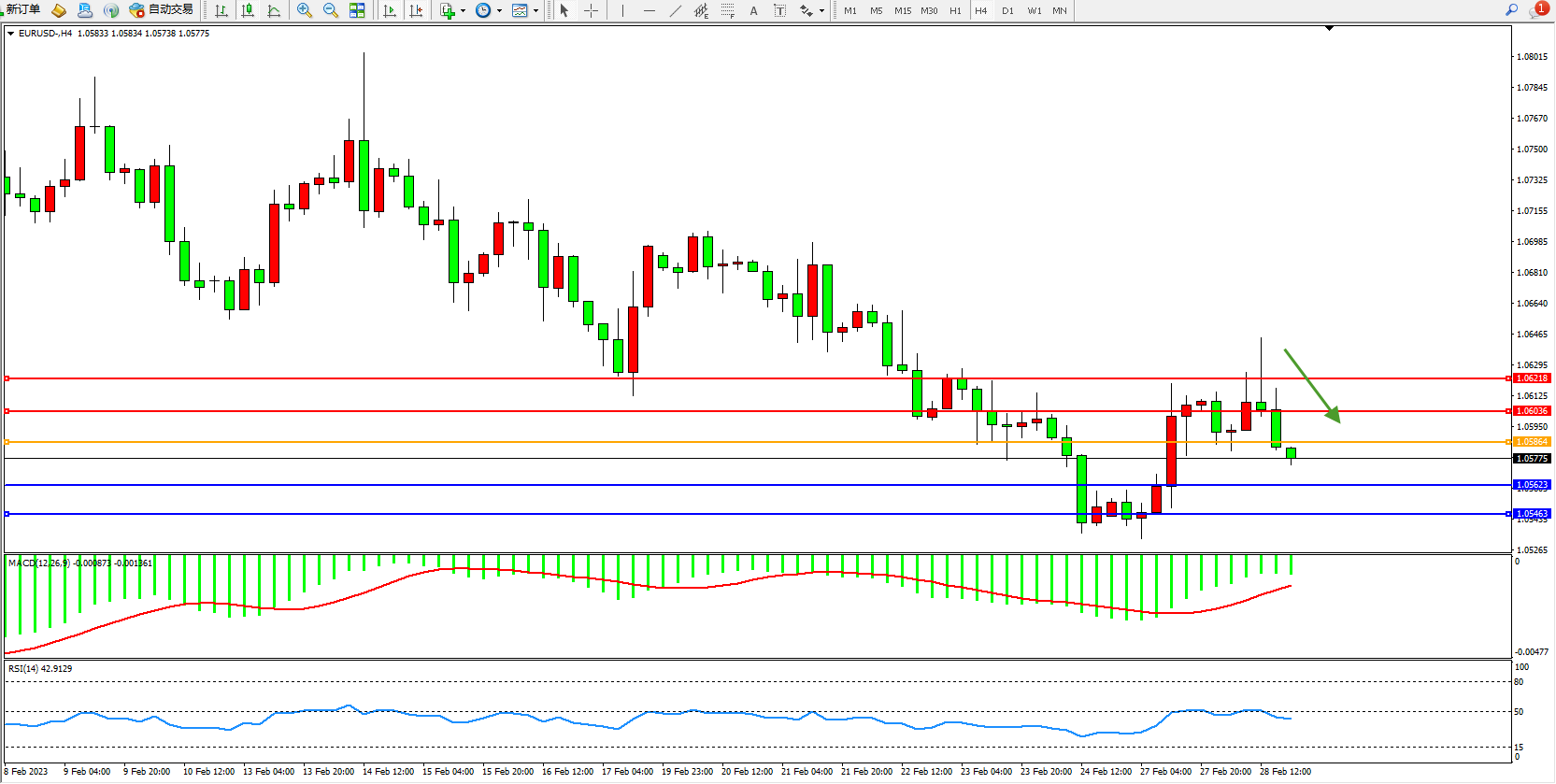 欧元美元EURUSD—4小时K线图显示: