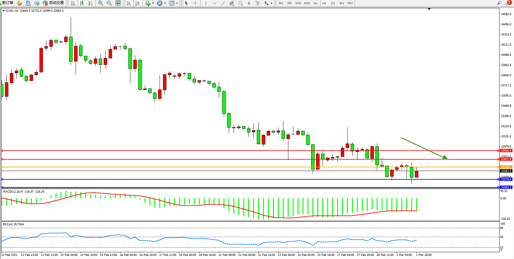 道琼斯指数DJ30——4小时K线图显示: