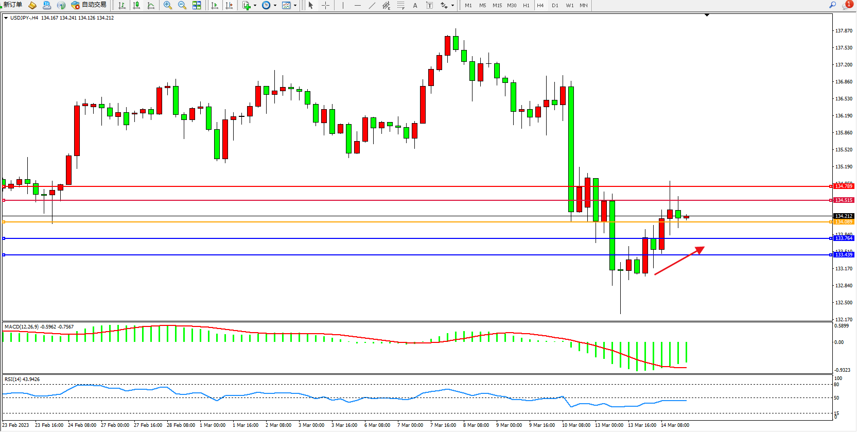 交易策略:134.089上方看涨,目标134.515 134.789