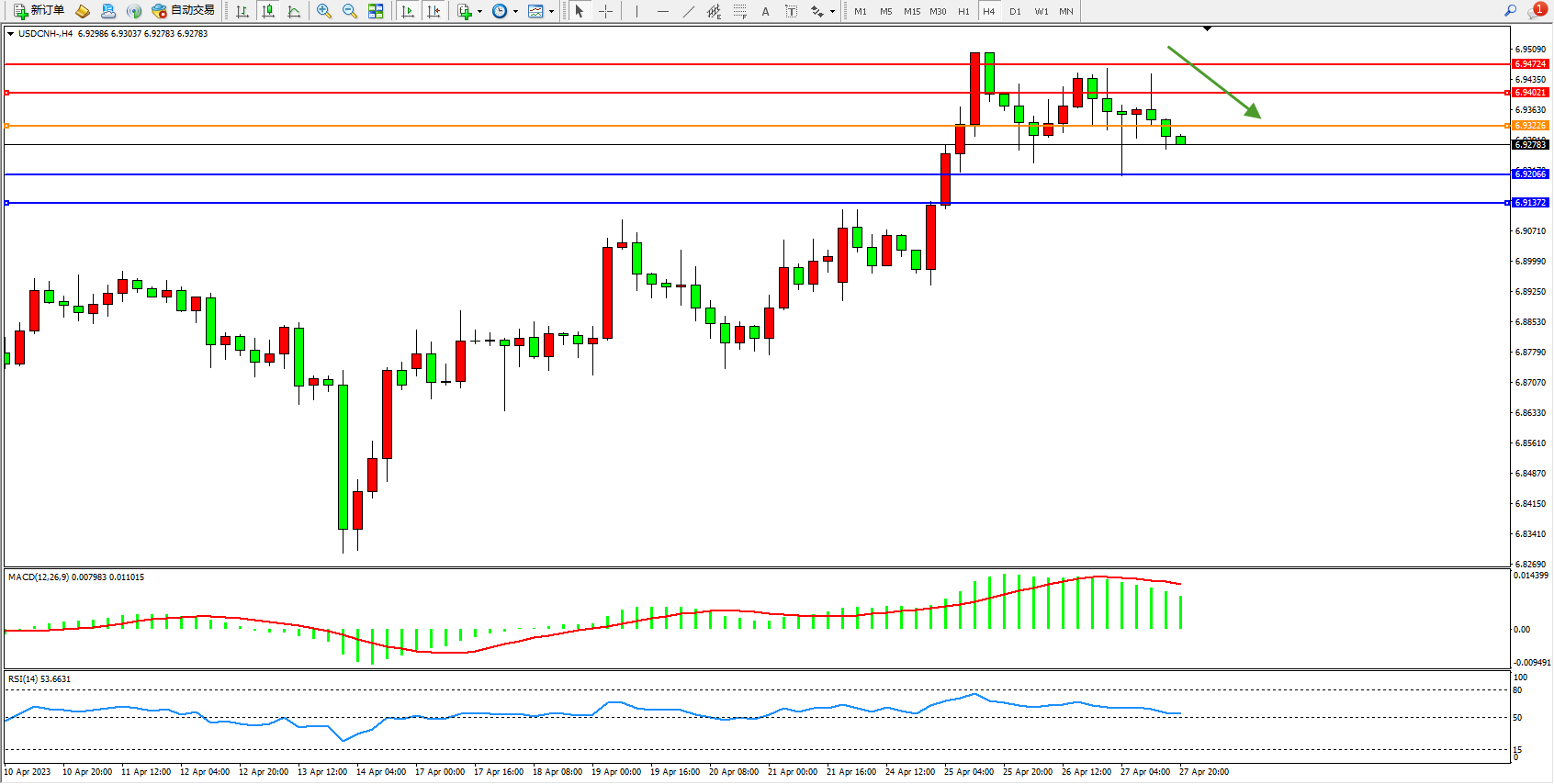 美元人民币USDCNH——4小时K线图显示: