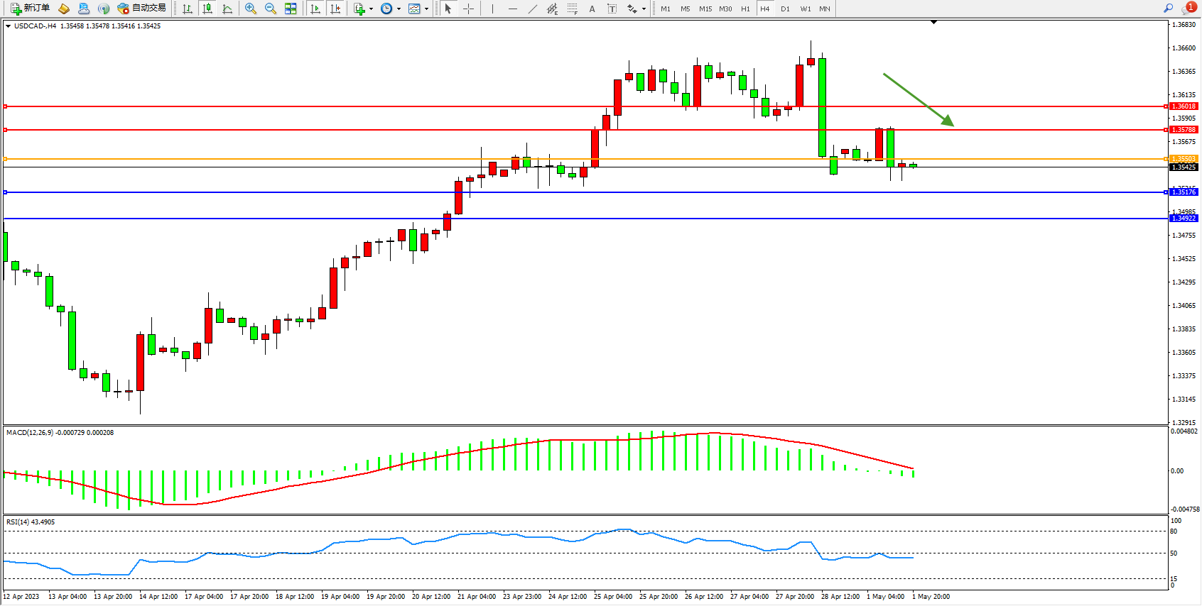 美元加元USDCAD——4小时K线图显示: