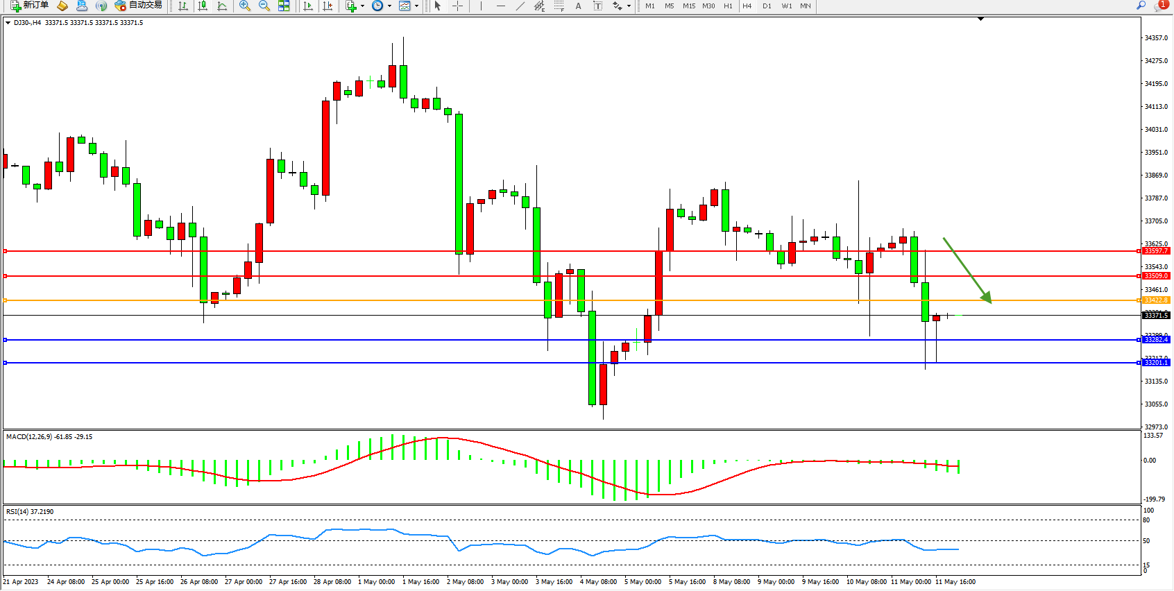 道琼斯指数DJ30——4小时K线图显示: