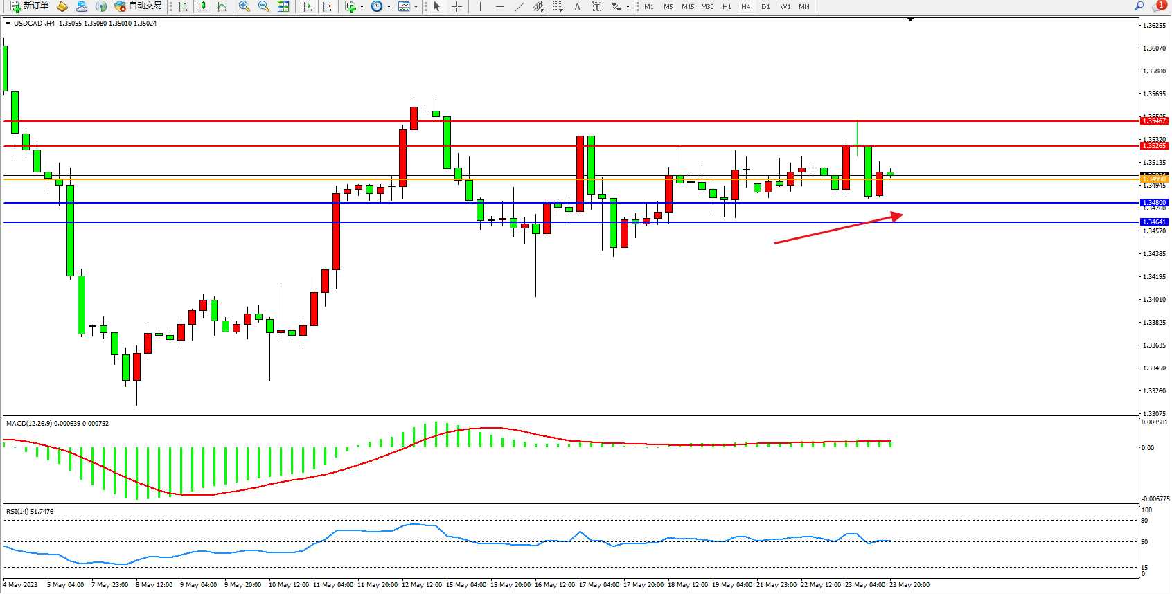 美元加元USDCAD——4小时K线图显示: