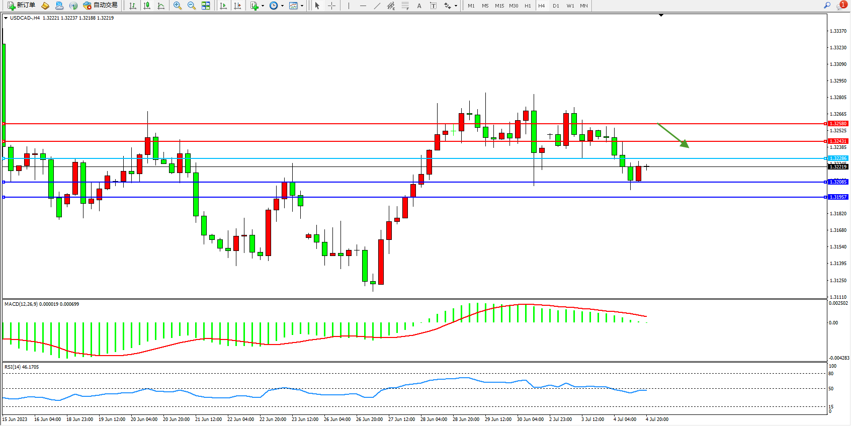美元加元USDCAD——4小时K线图显示: