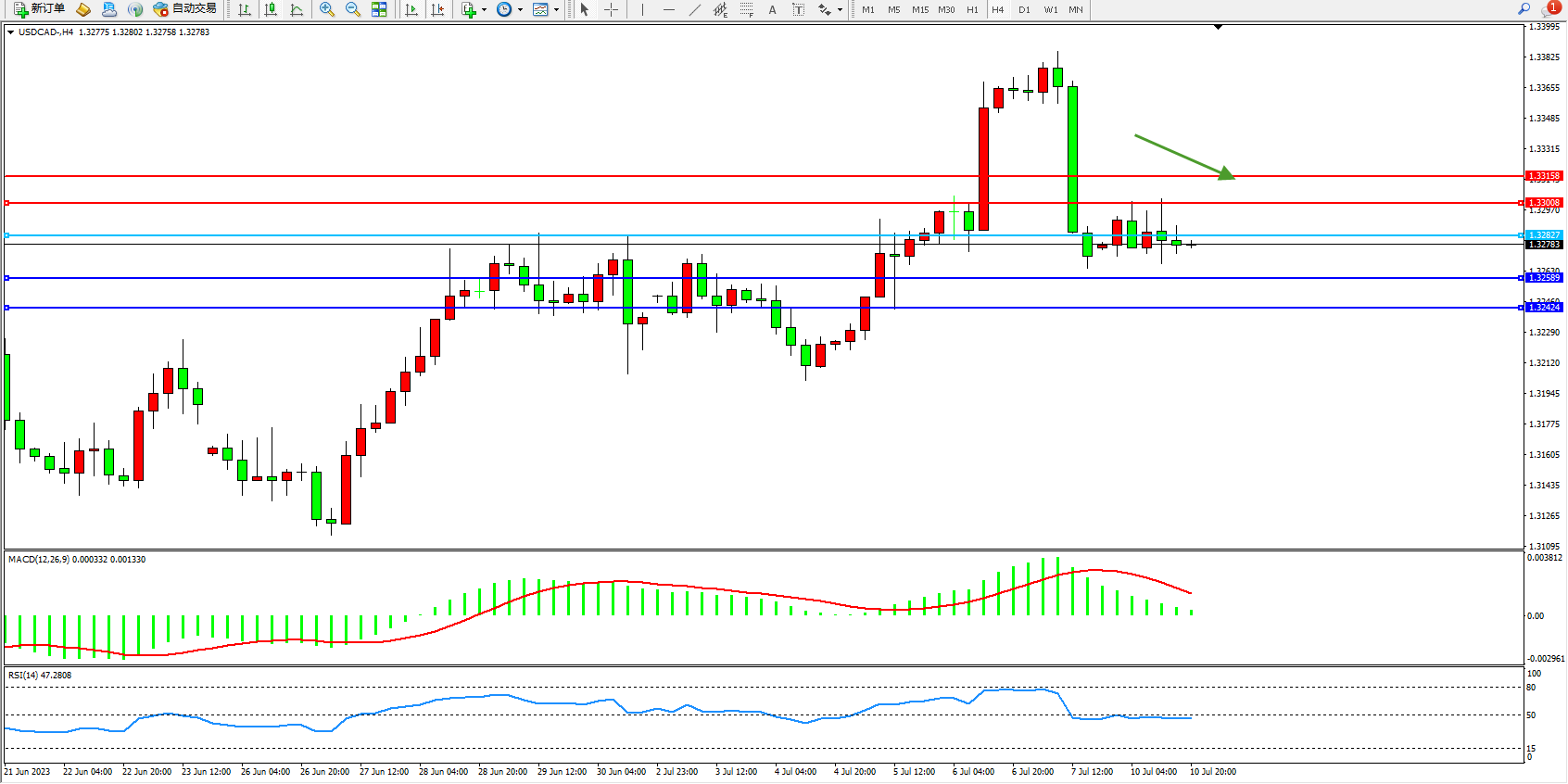 美元加元USDCAD——4小时K线图显示: