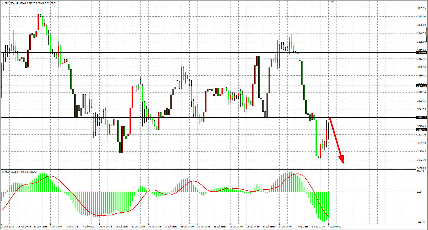 4小时图看,日经指数先跌后涨出现V型反弹,MACD量能维持零轴下,趋势继续维持空头,阻力关注32300-32700。