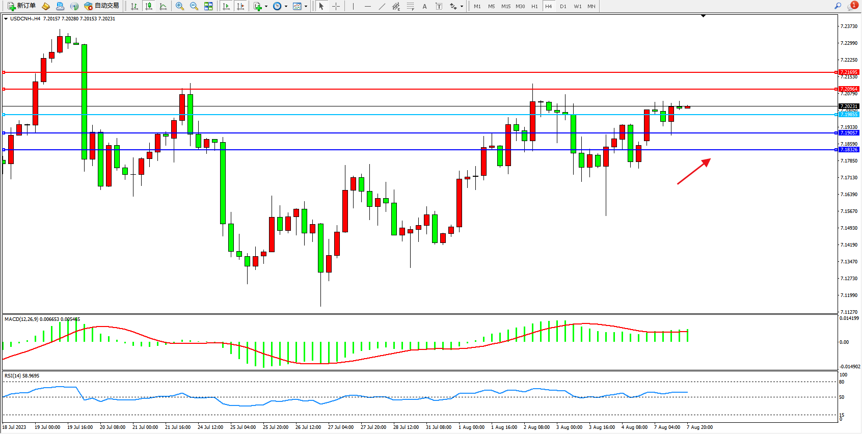 美元人民币USDCNH——4小时K线图显示:
