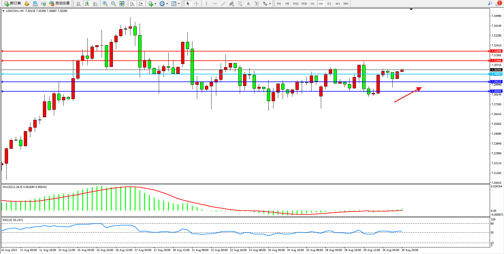 美元人民币USDCNH——4小时K线图显示: