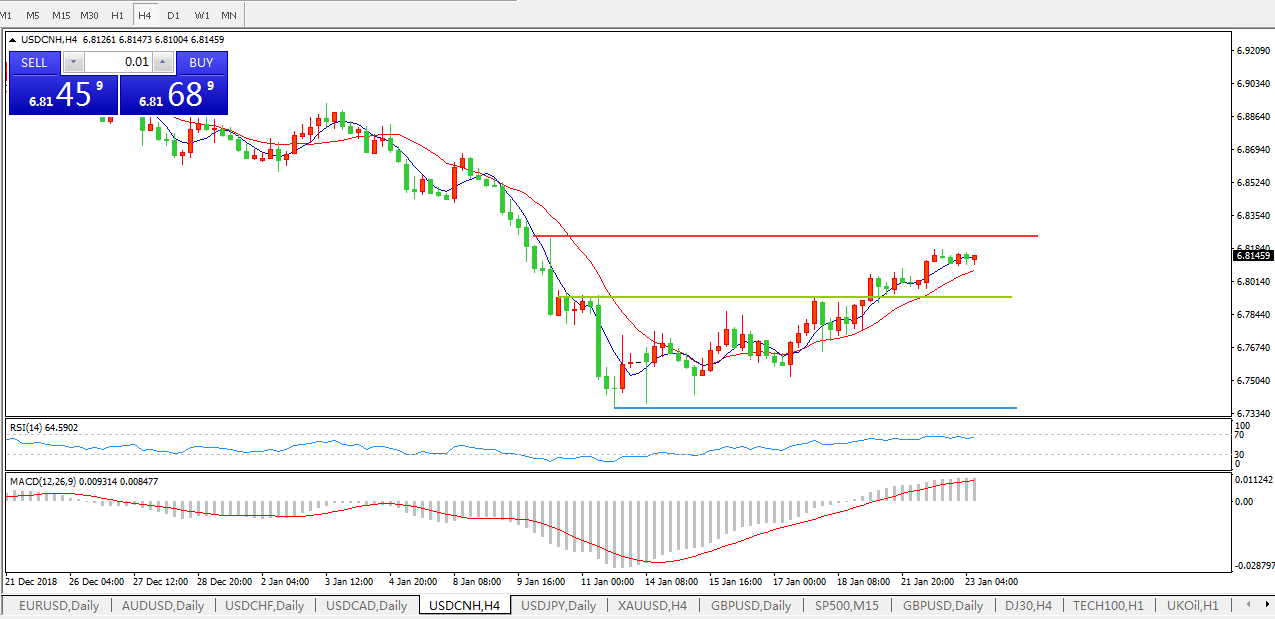技术面简析:4小时图均线金叉上攻,MACD0轴上方运行,动能柱放量企稳6.80重要关口,预计汇价将进一步走高