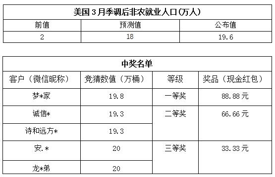 3月份非农就业人数大竞猜活动中奖结果已出,获奖信息如下: