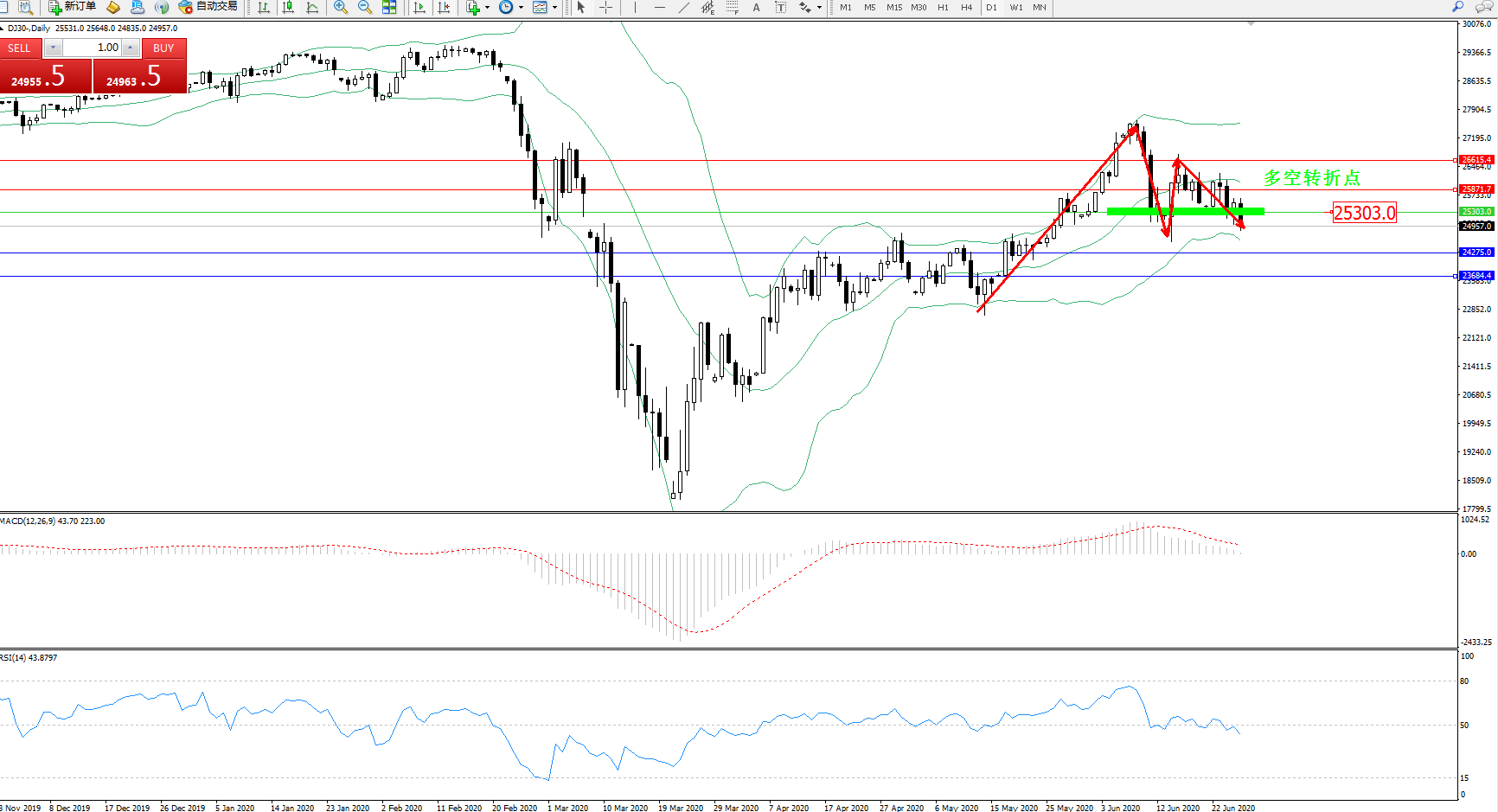 道琼斯指数6月26日(周五)收盘下跌730.20点,跌幅2.84%,报25015.41点。美股三大指数低开低走集体跌逾2%;美国股市跌至两周多以来的最低水平,新冠疫情的反弹开始为美国经济重启进程按下暂停键。银行股下挫,因美联储限制银行派息规模并禁止回购股票直至9月结束;广告客户的离去使Facebook Inc.创下3月以来最大跌幅,进一步加剧了大盘跌势。佛罗里达州和德克萨斯州是美国新增病例激增的主要地区,周五,这两个州下令再次关闭酒吧,并对餐馆实施更严格的限制,这对在疫情期间开放经济的努力是一个挫败。很明显,市场正经历深度经济滑坡。新型冠状病毒疫情不会被轻易地摆脱掉。