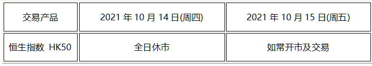 因应2021年10月14日(周四) 为香港重阳节假期,本公司以下产品的交易时间将于假期期间作以下安排,敬请留意。
