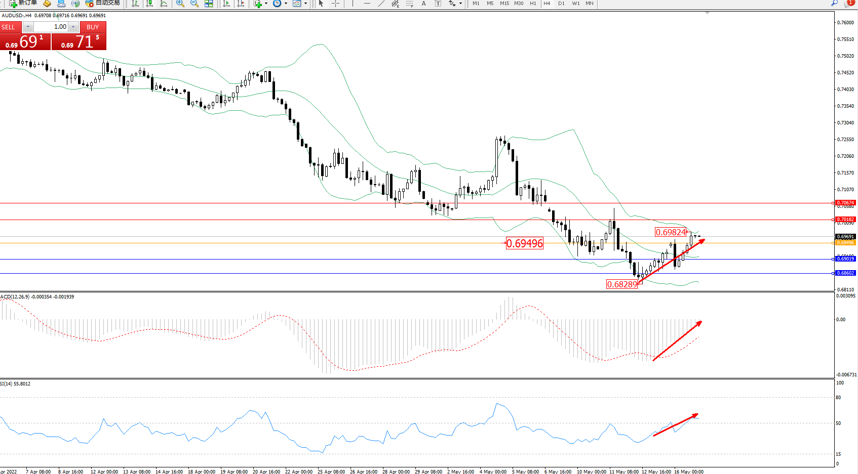交易策略:0.69496上方看涨,目标0.70182、0.70674