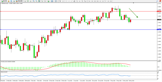 高位空头动力持续震荡下移,短期跌势未见止步,市场空头情绪笼罩,上方压制关注1.25836附近,低位支撑关注1.22871附近,MACD指标维持震荡下移至0轴线附近徘徊,RSI指标处于50均衡线下侧弱势整理,如图: